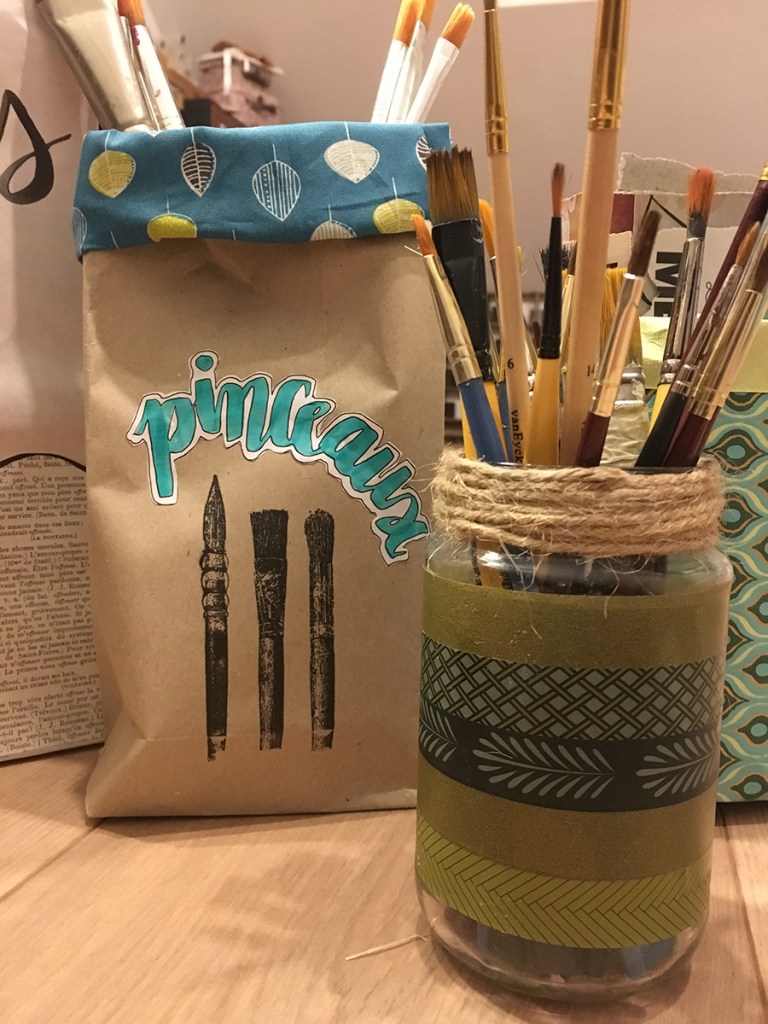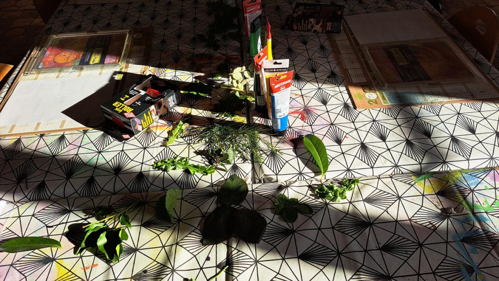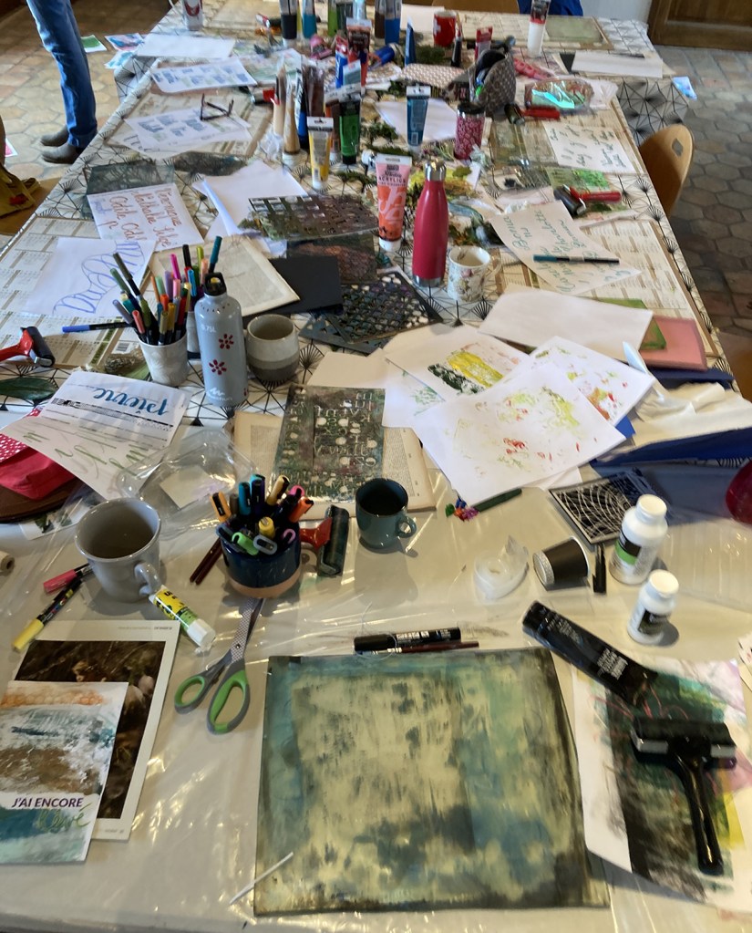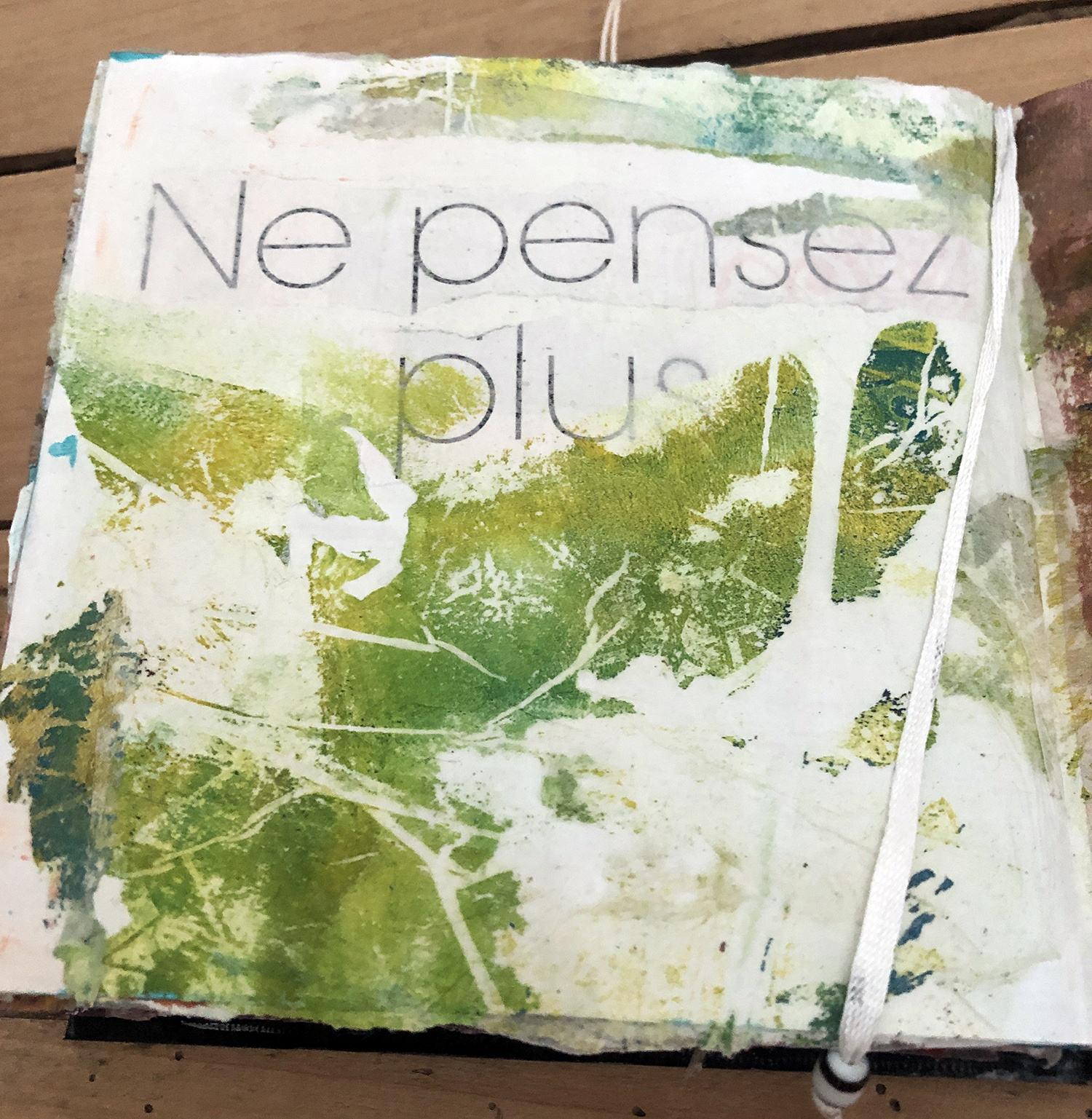 Nous avons exploré et expérimenté les nombreuses possibilités qu’offre la « gelli plate » ou « gel press » : empreintes végétales, utilisation de pochoirs, transfert d’image…