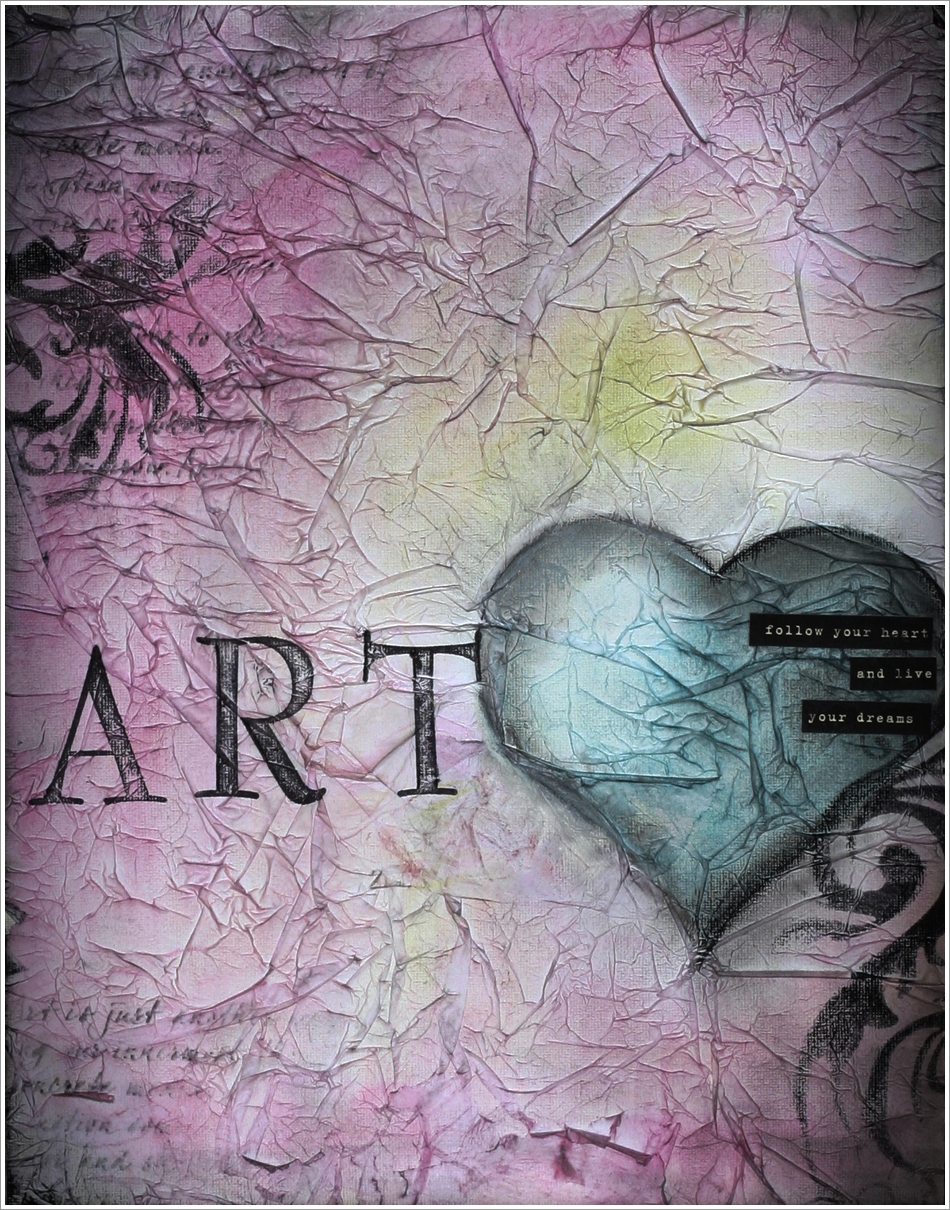 C’est superbe ce que tu as réalisé là. J’aime surtout le papier froissé, le coeur (on dirait qu’il est en relief) et les différentes écritures. Voici encore une nouvelle technique à ton arc …
