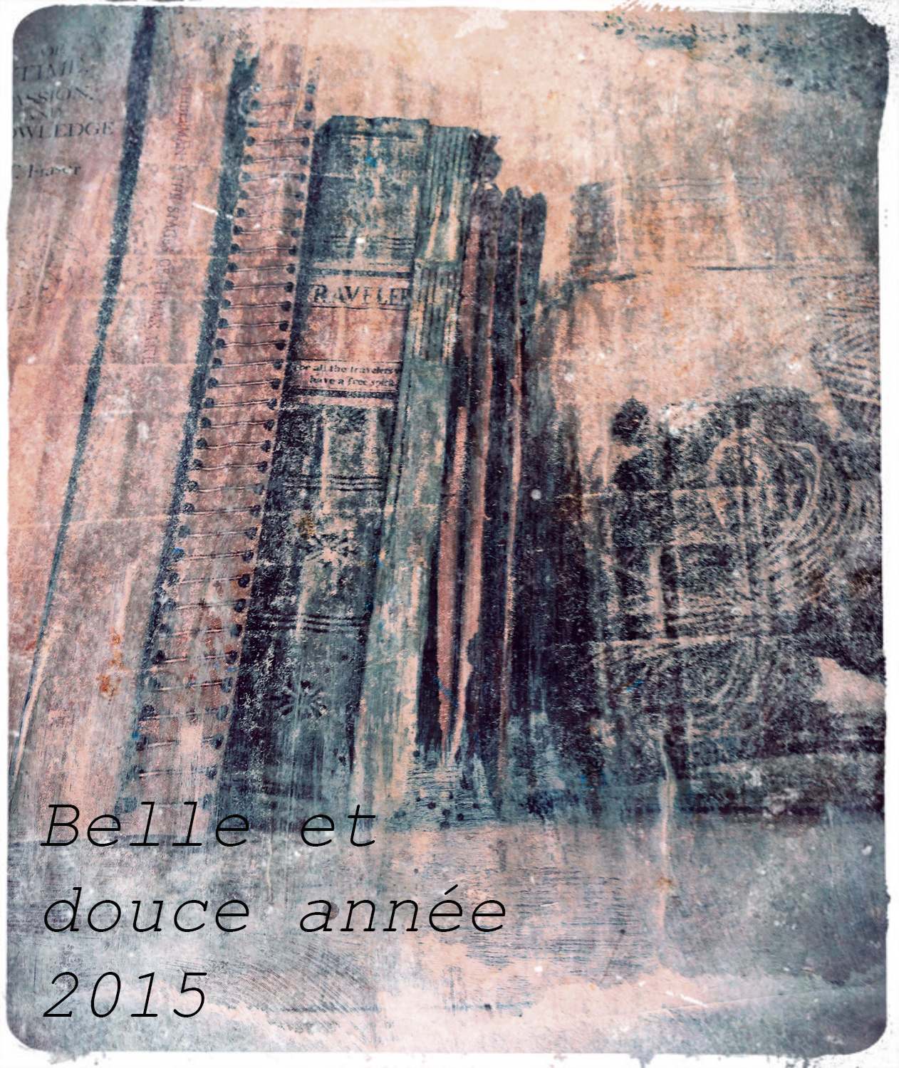 détail : on voit ici la superposition, l’écriture dans le gesso et le motif tamponné…