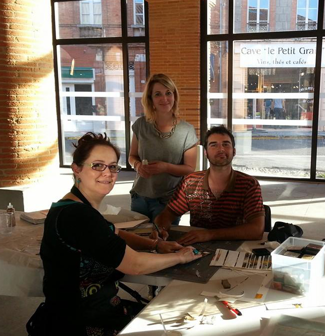 L’idée : un fil conducteur avec une chanson de Francis Cabrel, « L’ombre au tableau » sur laquelle nous avions travaillé chacun de notre côté. Nous avons proposé aux participantes notre interprétation du texte avec nos univers et techniques : l’acrylique pour Azoline, le collage pour Elisa, l’aquarelle pour Loren et des techniques mixtes pour moi. La dernière heure était consacrée à l’assemblage des 4 créations !