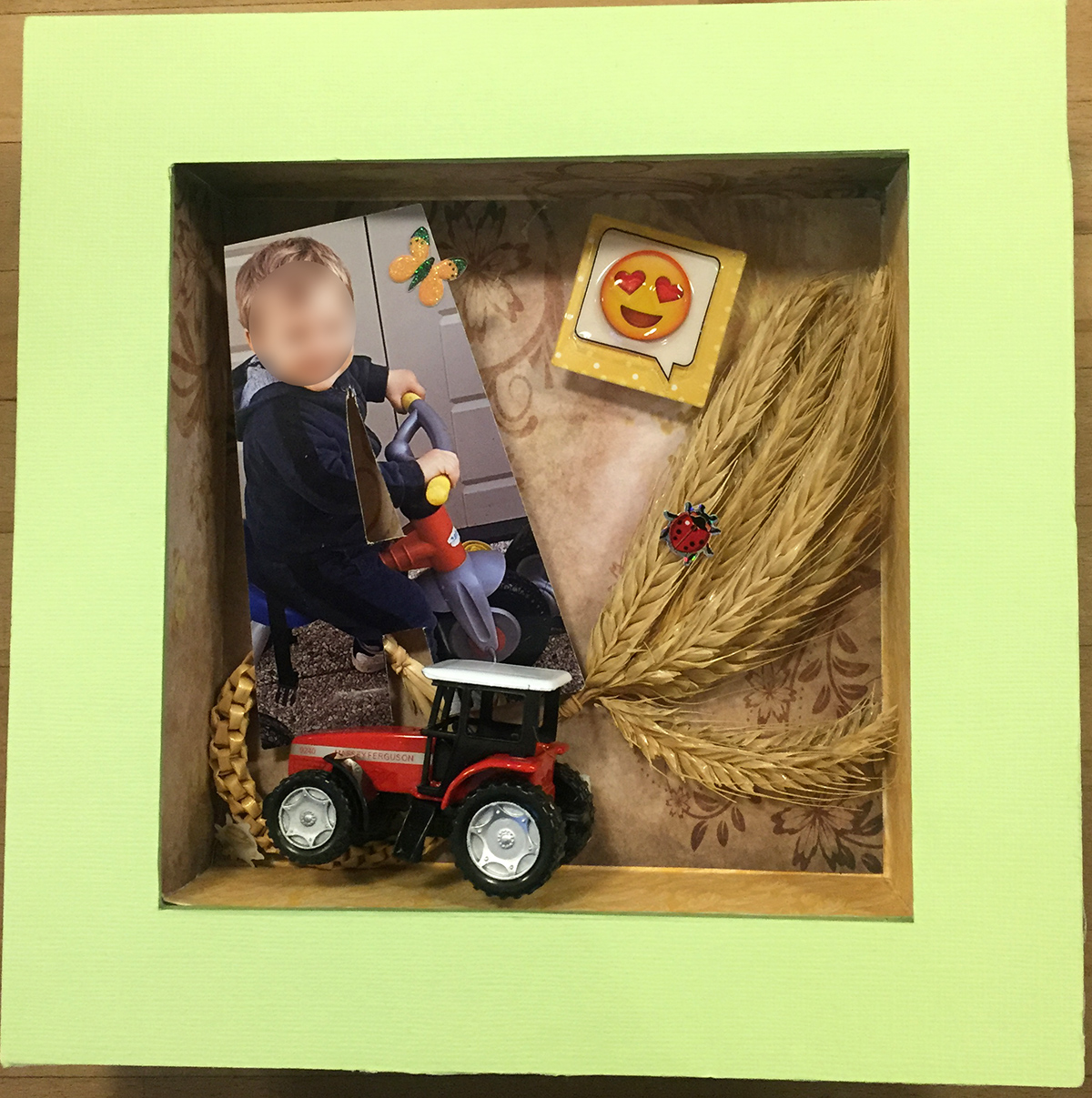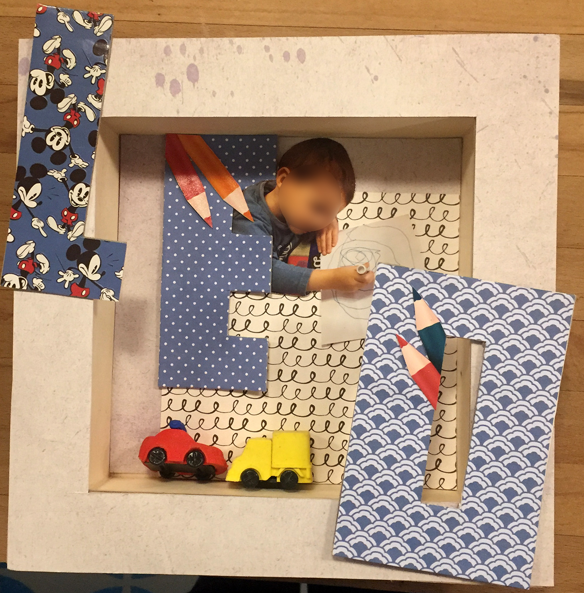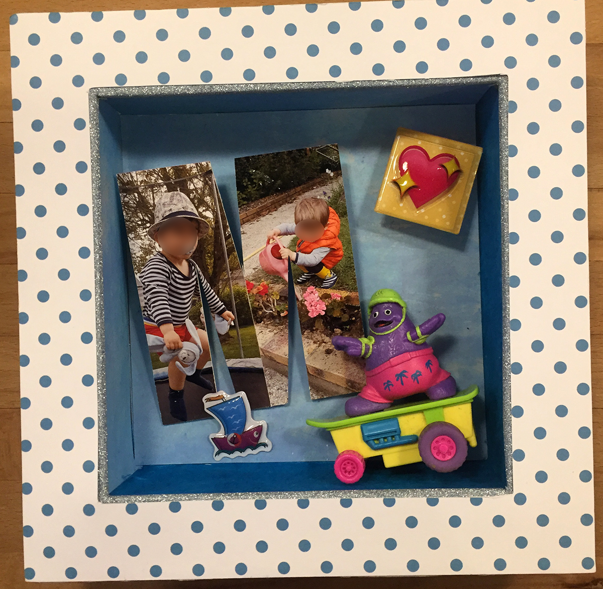 Raconter une histoire au travers de petites vitrines qui les unes à côté des autres formeront un prénom, un mot, une initiale. S’amuser avec les photos, les détourer, les mettre en scène, jouer avec la profondeur, ajouter de petits objets…