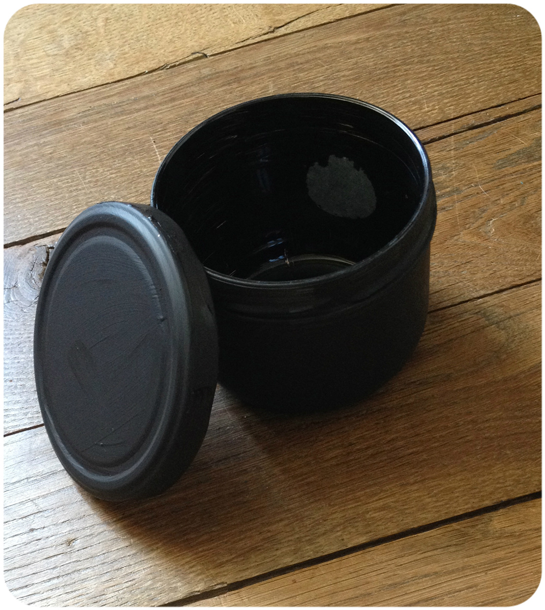 Passer deux couches de gesso noir sur votre support. Ici un bocal en verre avec un couvercle métal. Le gesso s’applique très facilement et laisse un fini mat.
