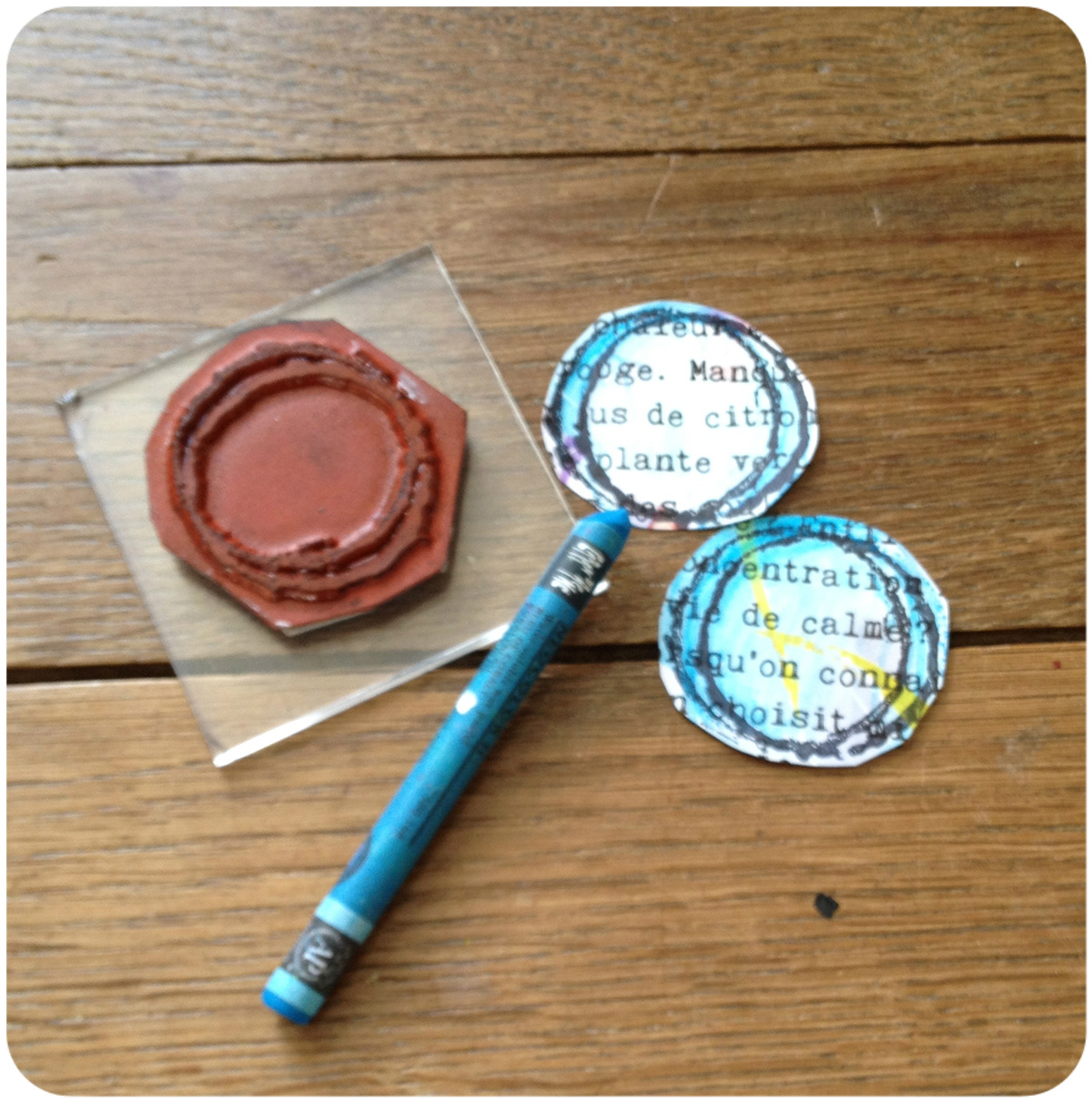 Tamponner une forme simple sur une page de magazine ou de livre (encre Stazon de préférence car elle résiste à l’eau) . Colorer ensuite à l’aide d’un crayon aquarellable (ici des « Néocolors »).