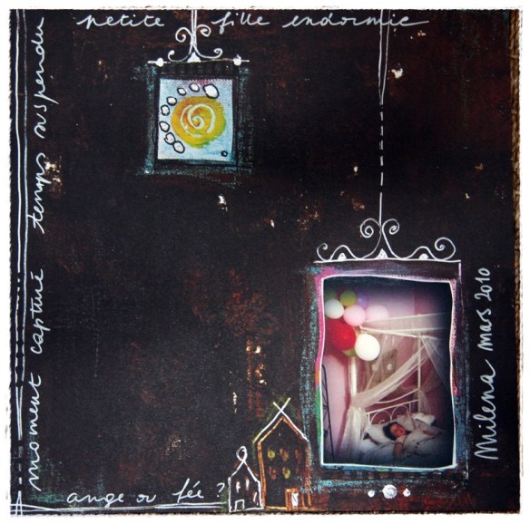 Pour cette page j’ai utilisé la technique du transfert avec le scotch de masquage (voir l’article de Séverine Sorbier dans le dernier « Histoires de Pages »). J’aime beaucoup le résultat !