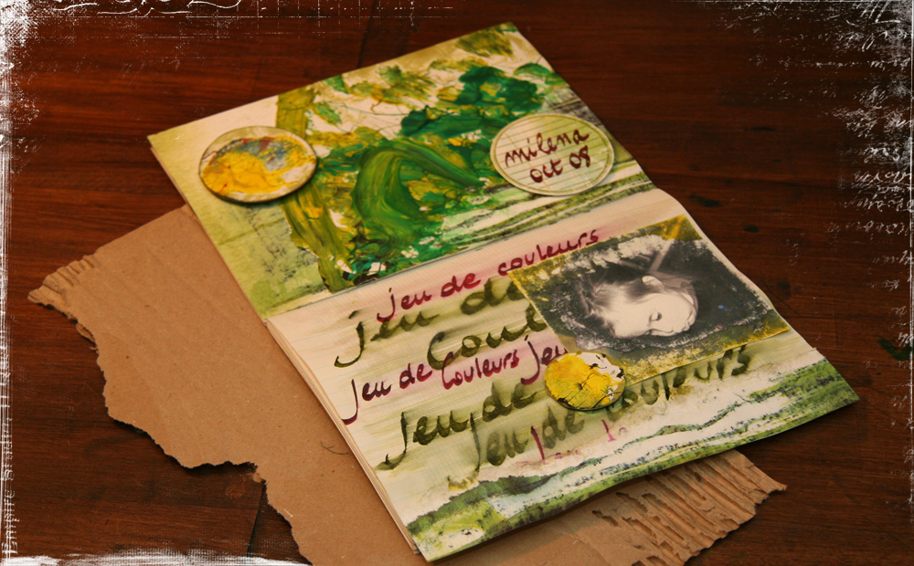 Voici la suite de mon petit « cahier bucolique » qui parle de la vie de ma fille Milena… La photo utilisée a été prise un matin ensoleillé de novembre et transférée grâce à la technique du gel medium. (technique découverte et très bien expliquée dans le premier EntreArtistes Magazine).