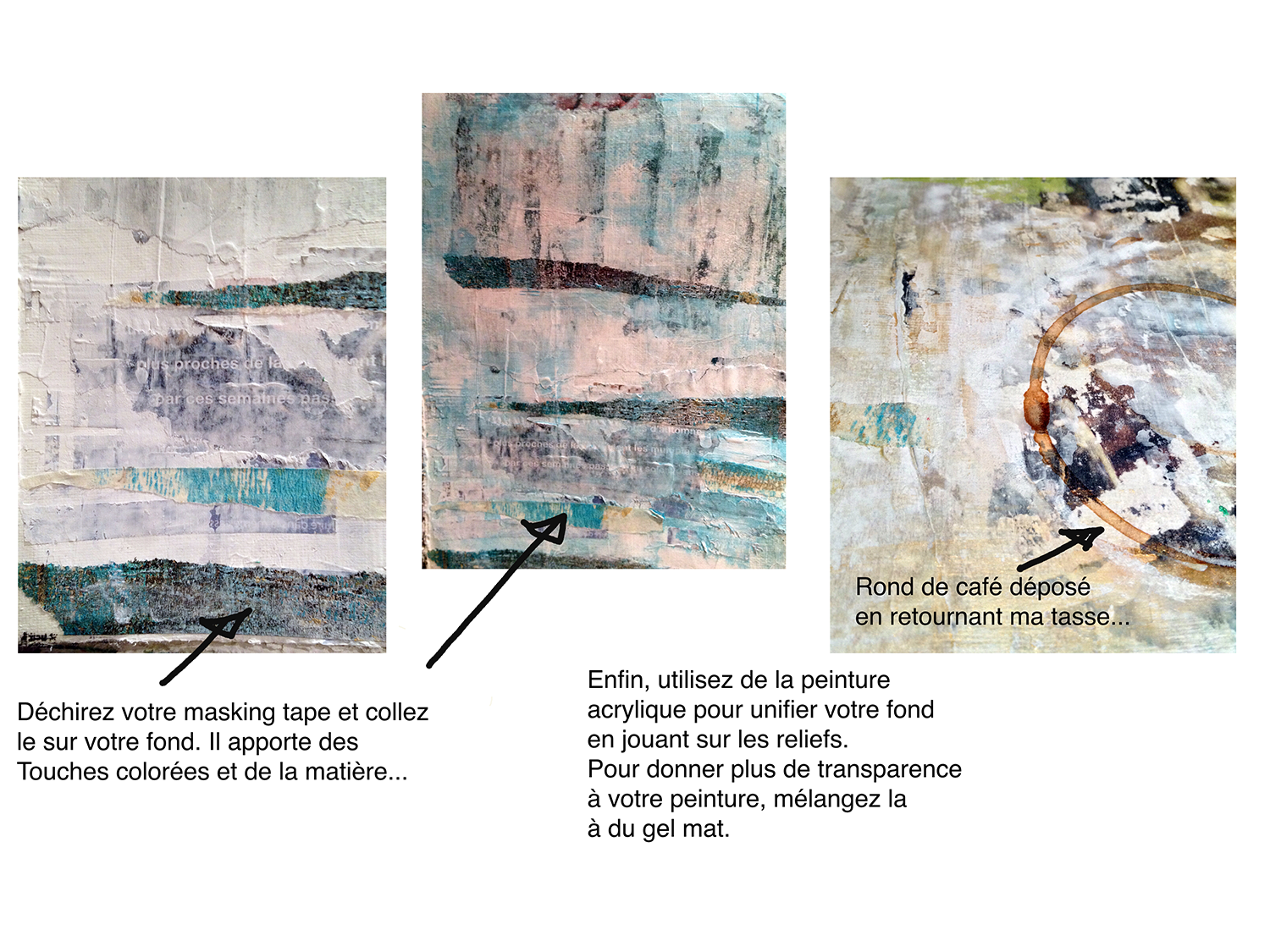 Pour ce thème, j’ai choisi ma boisson préférée : le café… Et pour respecter la contrainte, j’ai posé ma tasse à l’envers pour déposer du café sur mon fond. Le support est une double page de mon Art Journal en cours.